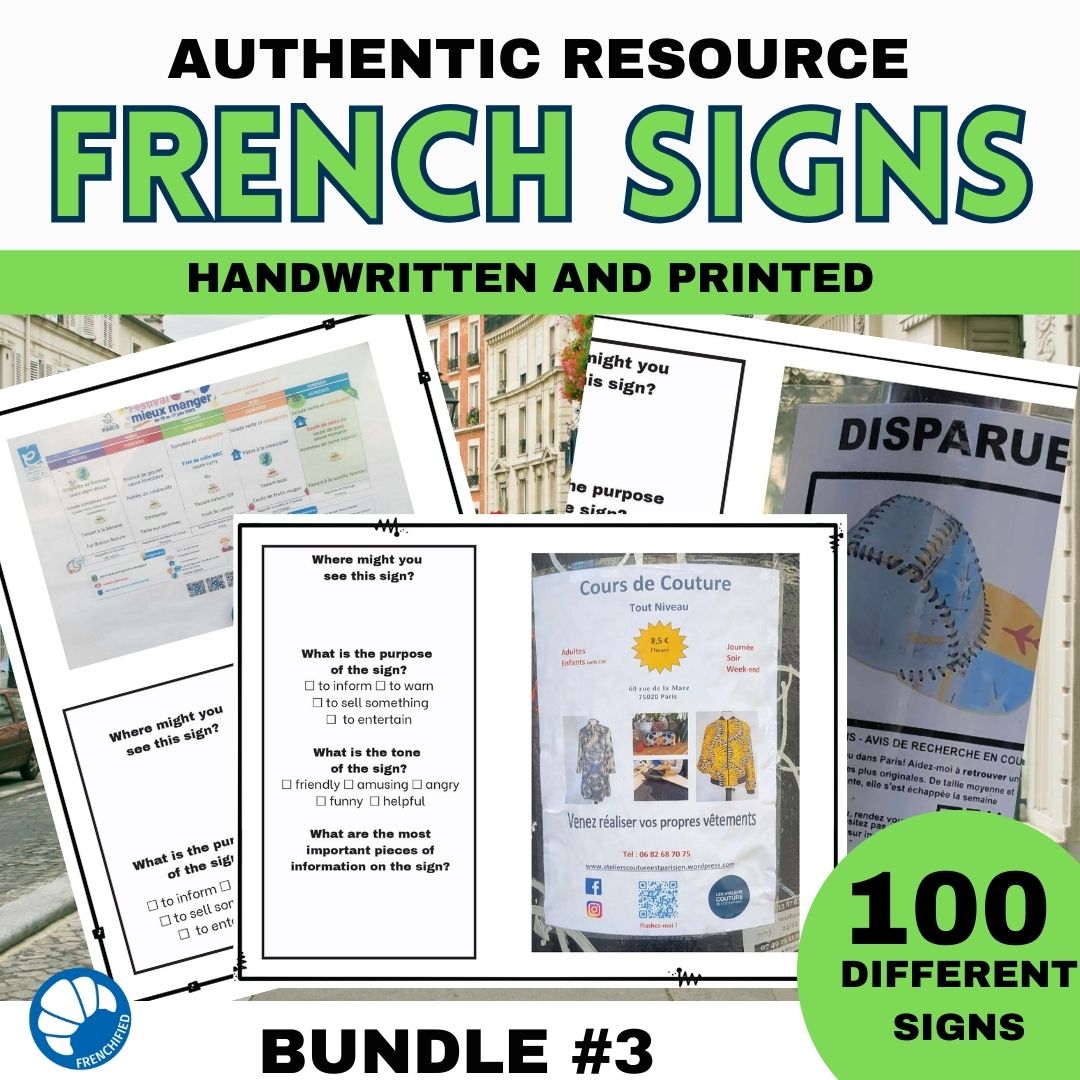 100 different French signs from different places in France, all collected and ready for your use. A wide variety of topics and purposes – ads, notices, informational, historical. The signs in set 3 are all printed, some are very professional while others are more casual – signs printed from a person on their home printer.