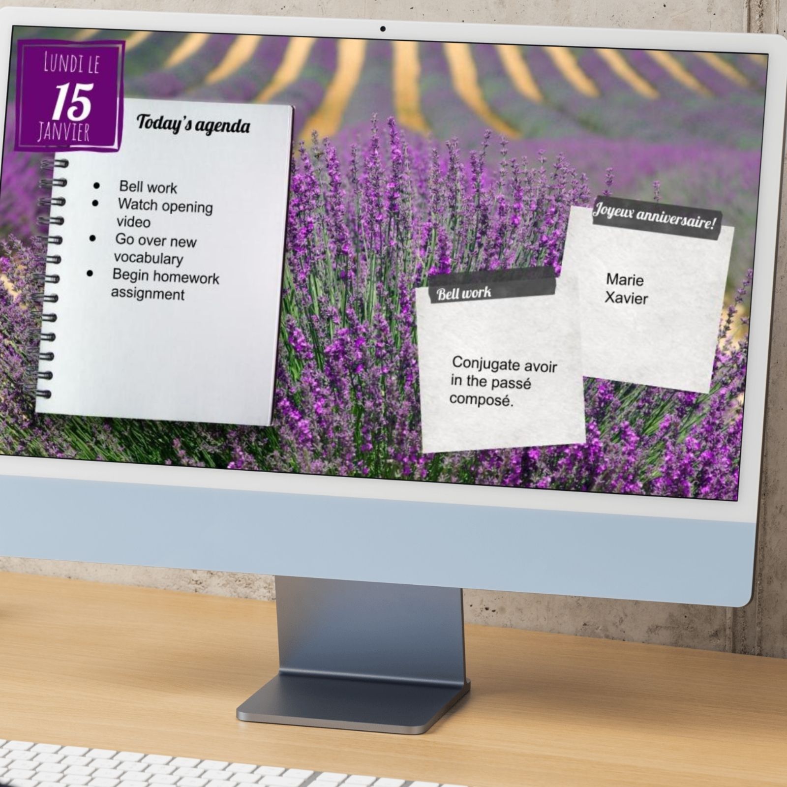 Upload these France agenda slides to use as a background in Google classroom, on a smart board, or anywhere you like! You can edit the text, date, and sections to meet your needs. Keep your class organized and share each day’s agenda and goals with students.