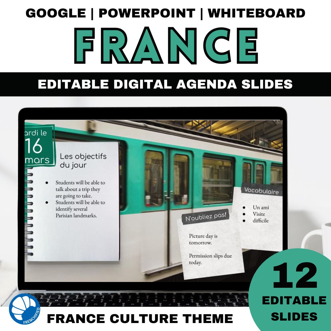 This set of 12 France agenda slides will allow you to share your daily information with your students in an organized fashion! Each slide has a section for the date and three sections for information. The text is completely editable, so you can use whatever font and content you like.