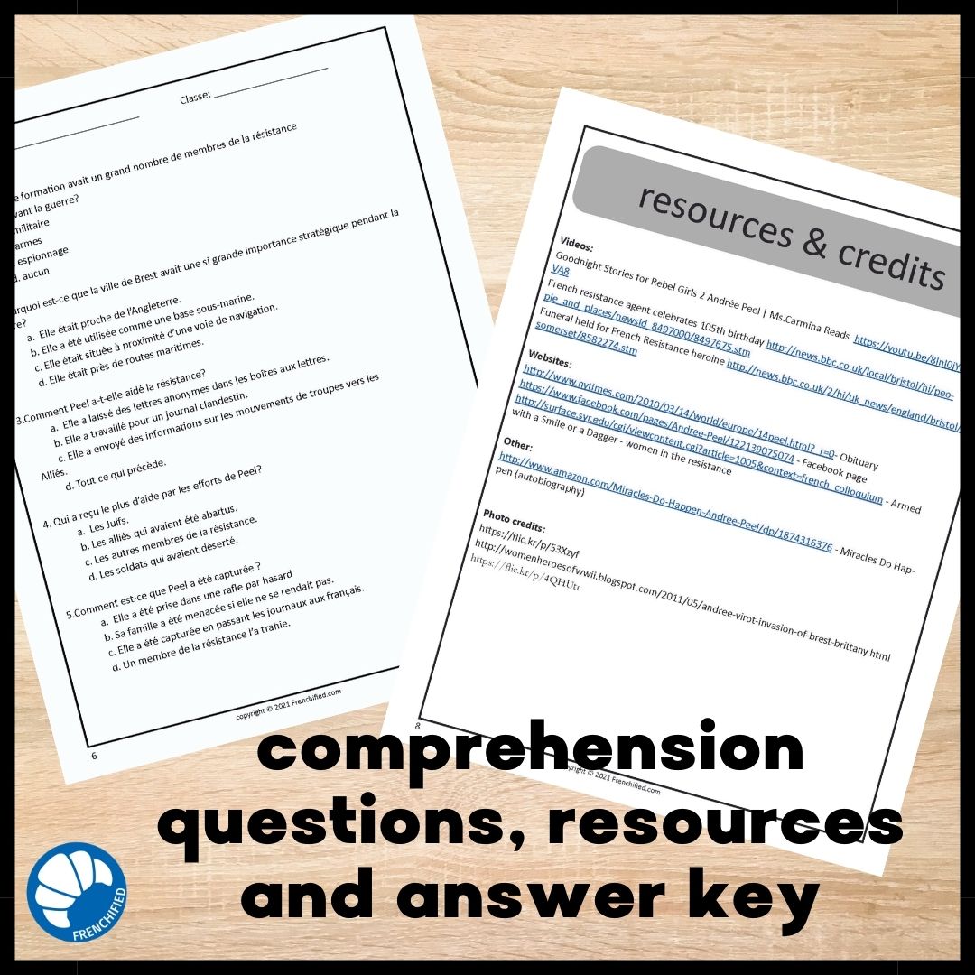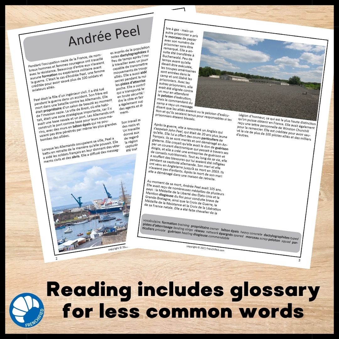 This Andree Peel bundle French reading comprehension activity will teach your students about French resistance heroine Andrée Peel. After losing members of her family to the Nazi invasion, she fought back in courageous ways, barely escaping with her life. Her life after the war was equally interesting. Intermediate low learners will be able to understand the reading with scaffolding and teacher support while Intermediate mid and higher will be able to read independently.