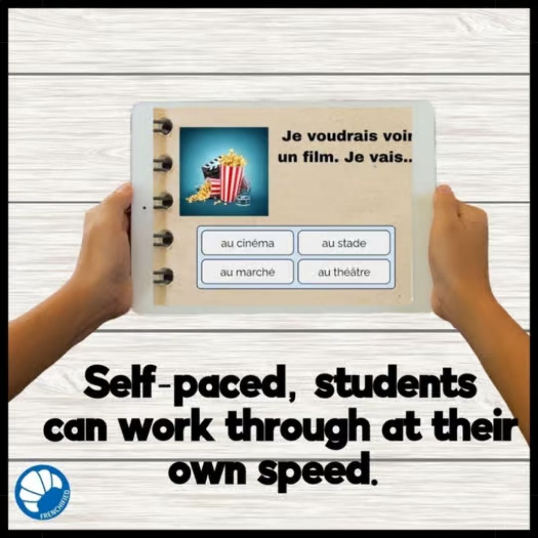 This set of digital task cards practices the French vocabulary en ville – for places in town. 10 cards have a sentence to say what the person wants to do and the student chooses the place they would go; 10 cards have an image and the student chooses the word that corresponds.