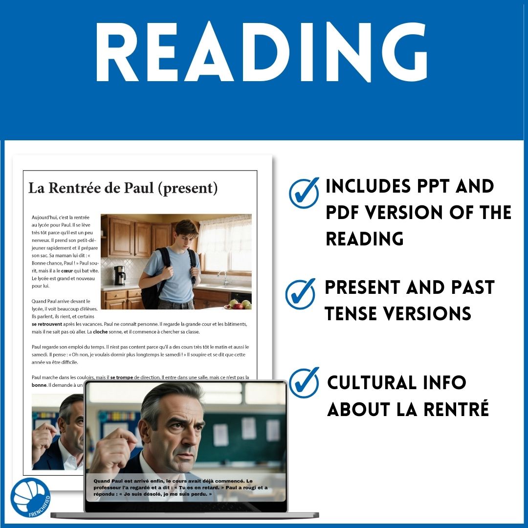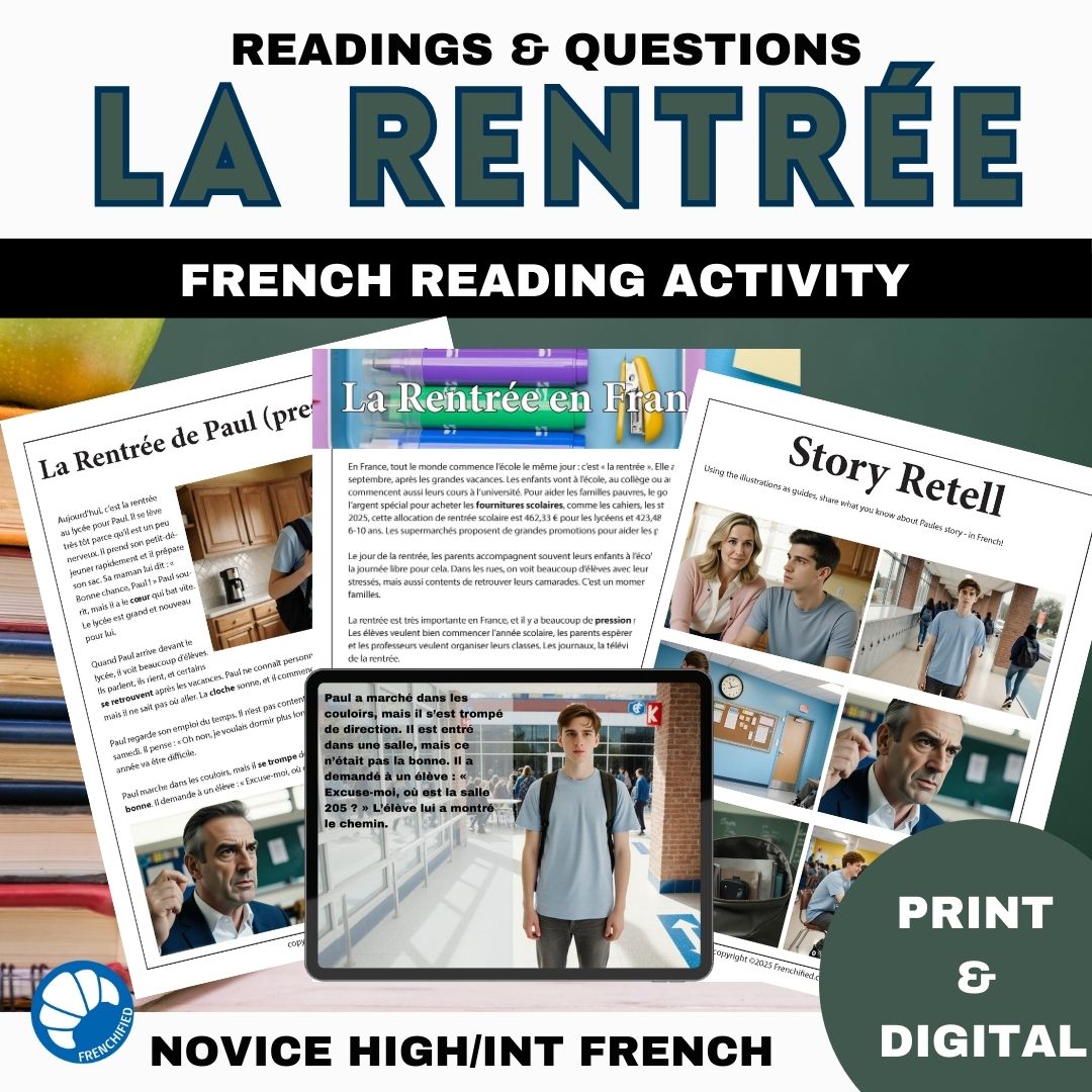 This fun beginning/intermediate level French back to school reading comprehension activity is a short story about a boy starting at a new school – his first day of high school. Things don’t go well for him, but the day starts to get better as it passes.