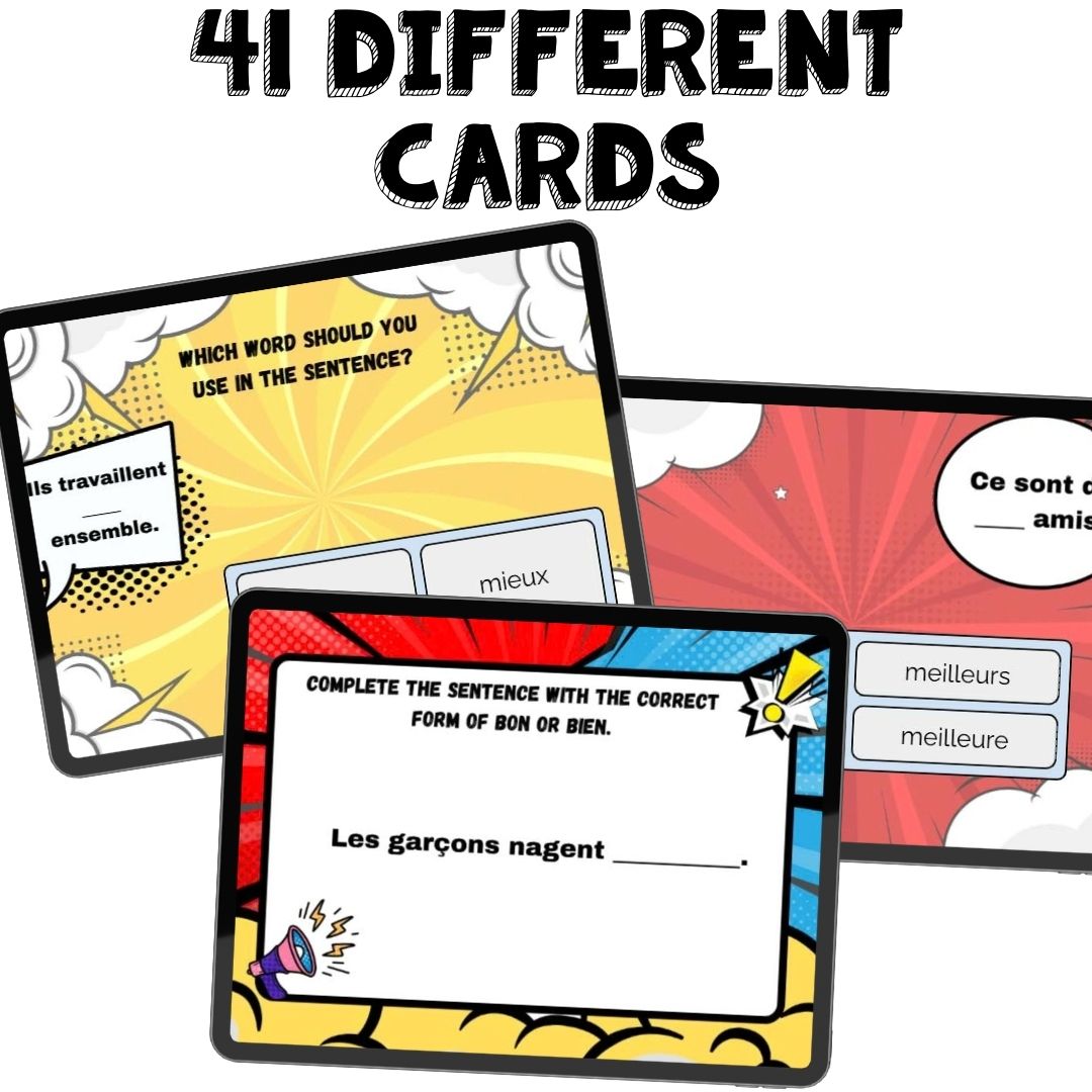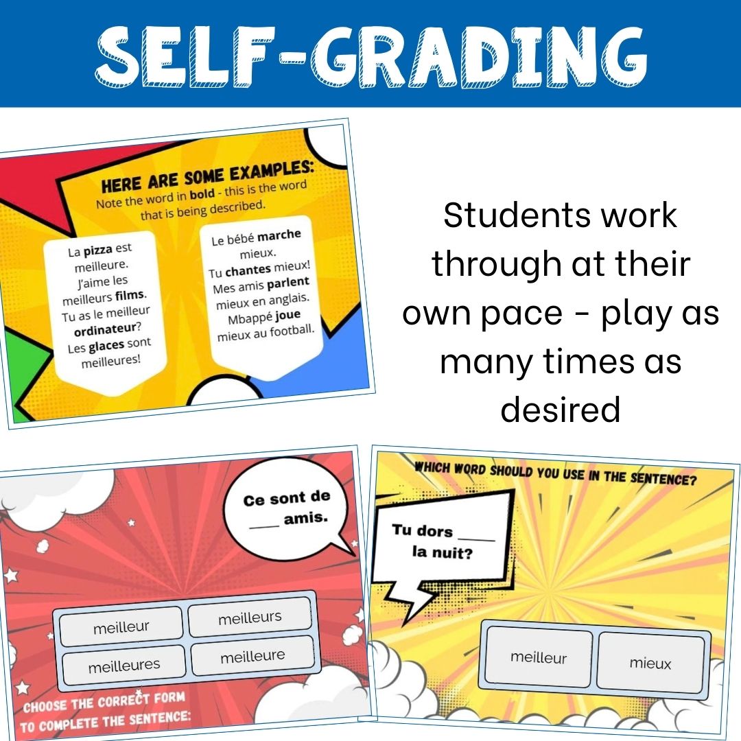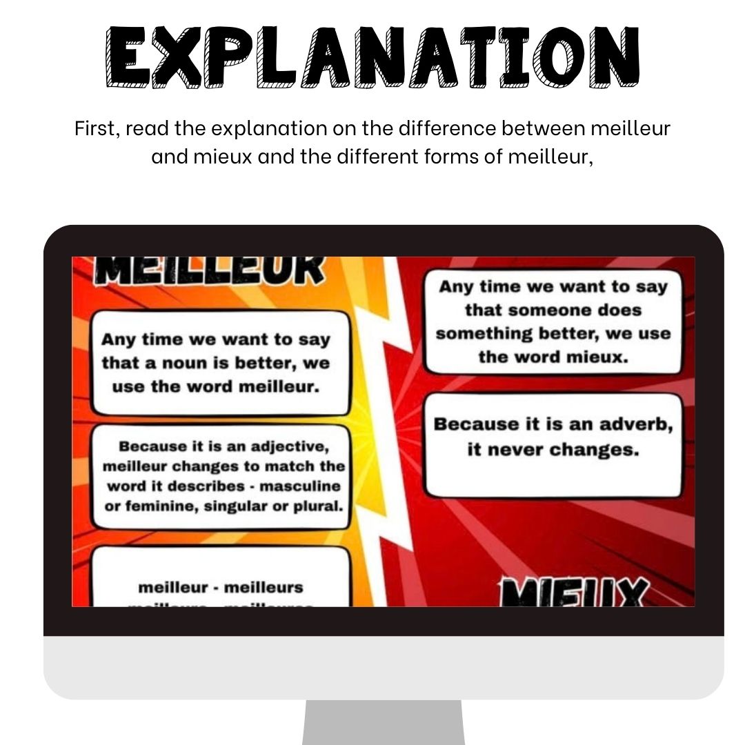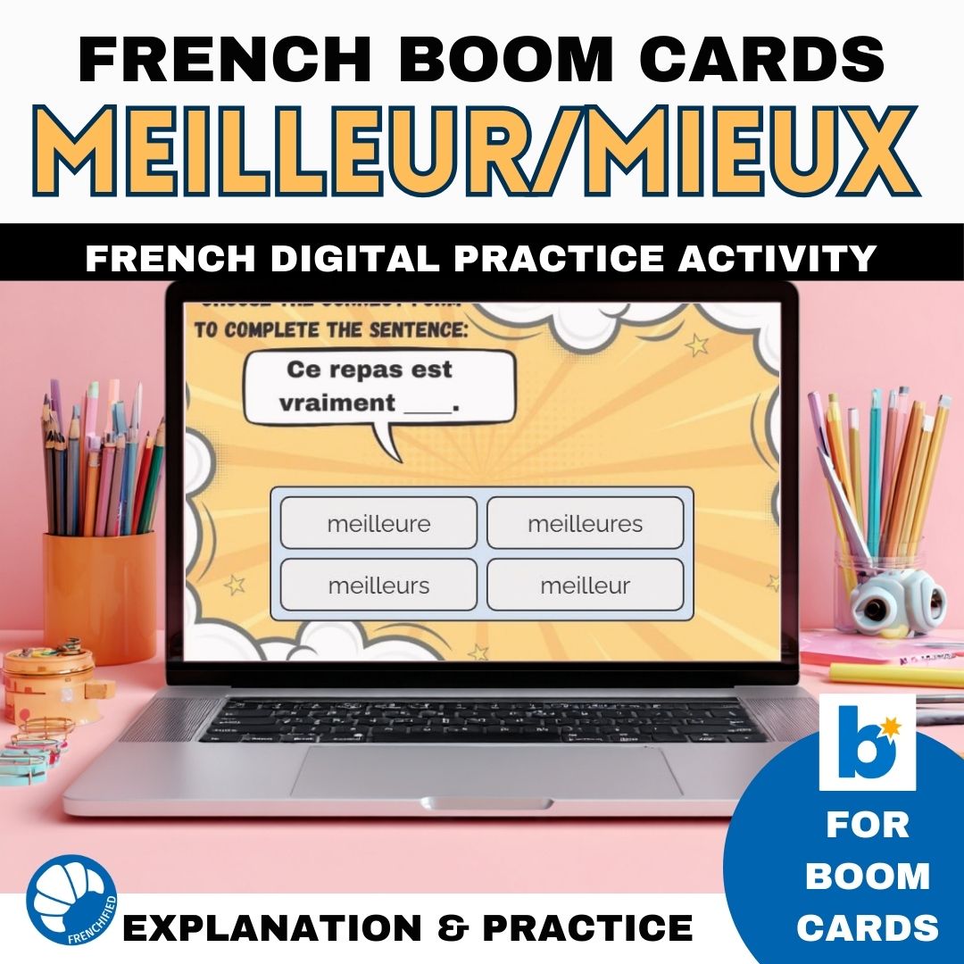 This set of French Boom cards digital task cards practices the difference between meilleur and mieux and how to choose the correct word.