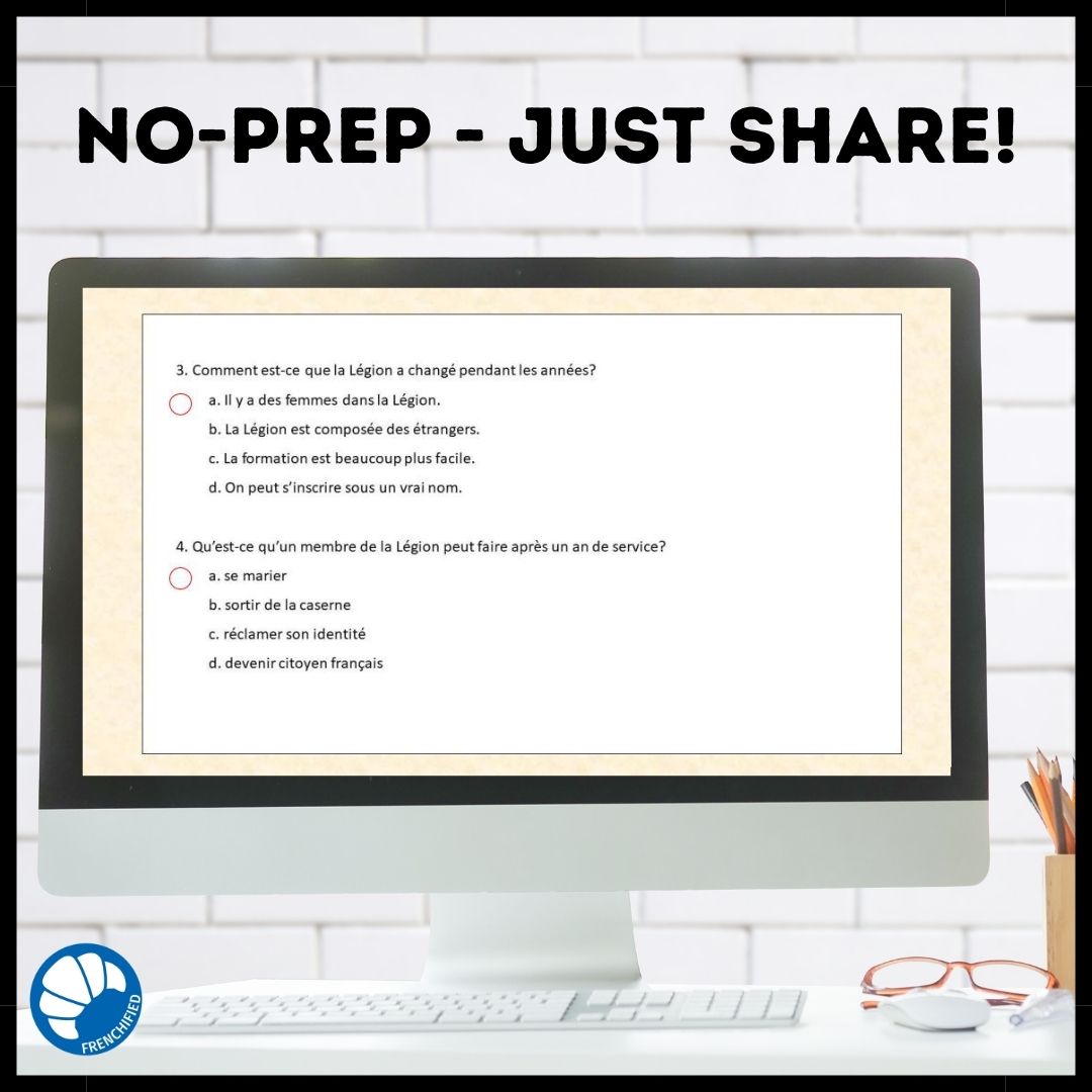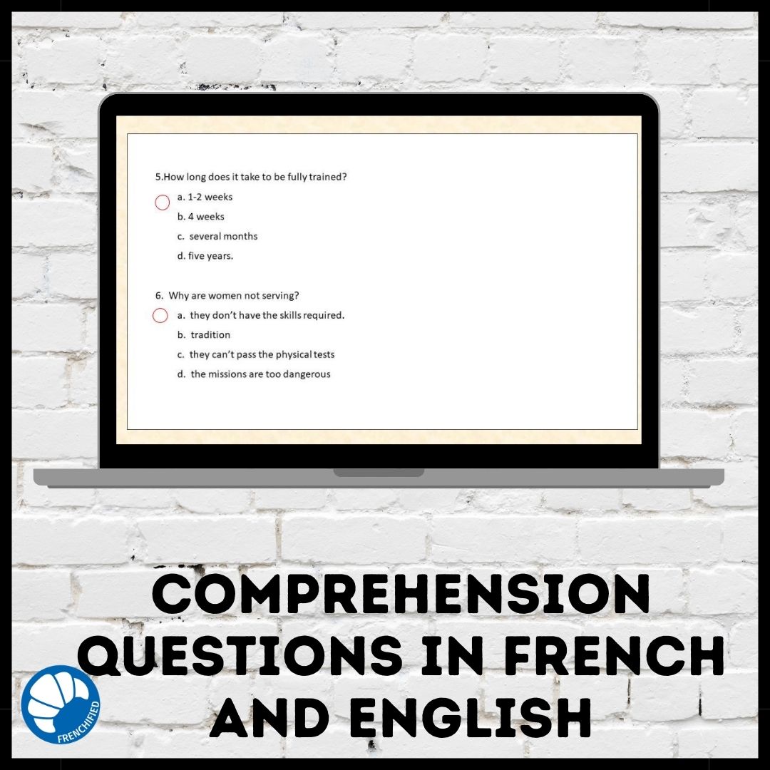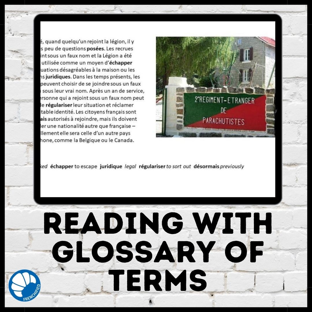 This French Foreign Legion Google Drive™ French reading comprehension activity will teach your students about the French Foreign Legion. The French Foreign Legion is a military unit with nearly two centuries of experience in fighting and serving in some of the most dangerous areas of the world. Learn about why it was formed, how recruits are trained, and how this unit is different from other parts of the French military. Intermediate low learners will be able to understand the reading with scaffolding and teacher support while Intermediate mid and higher will be able to read independently.