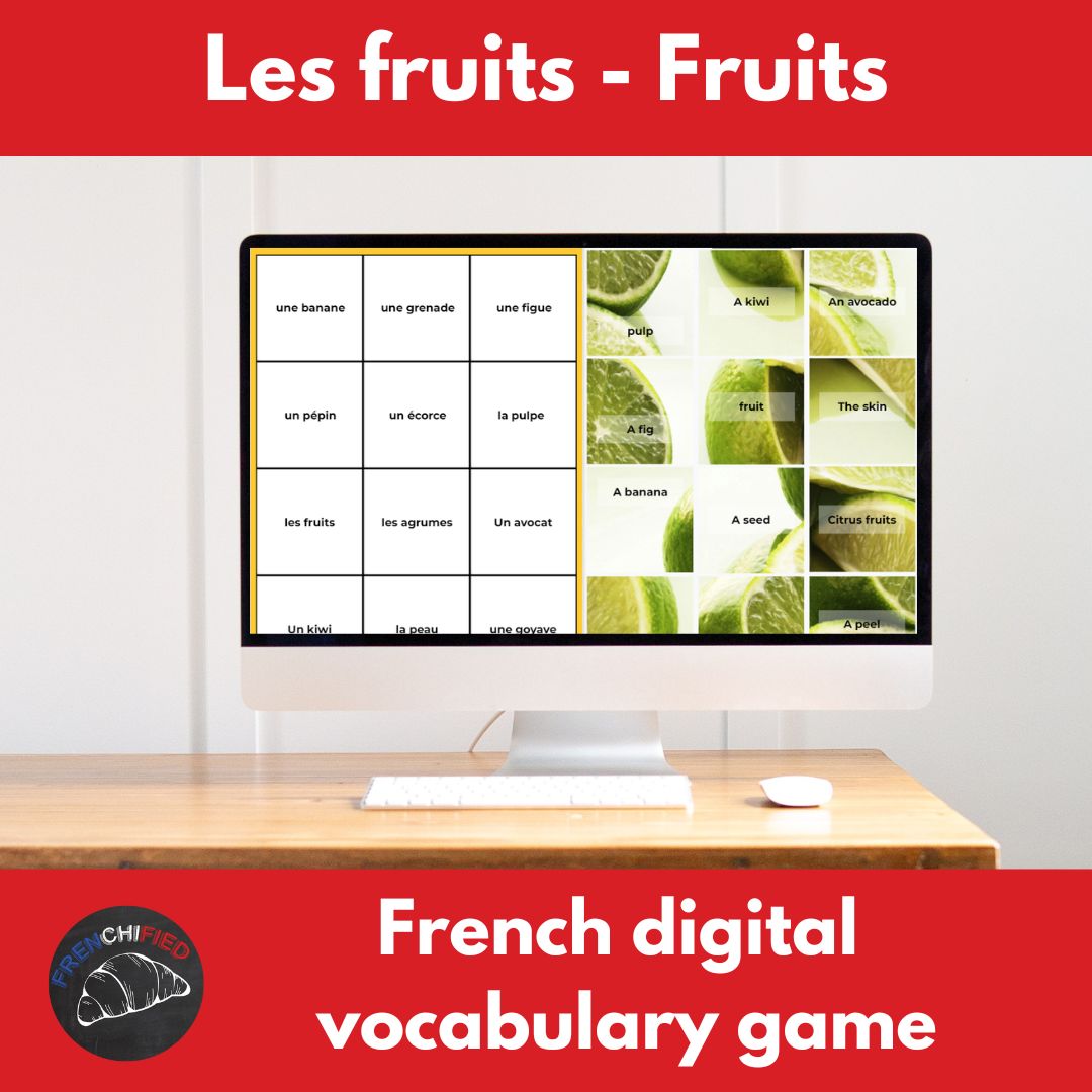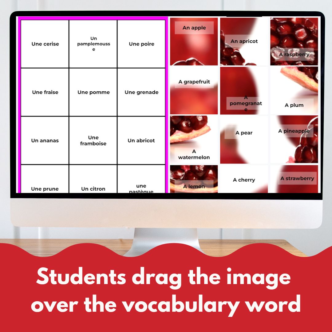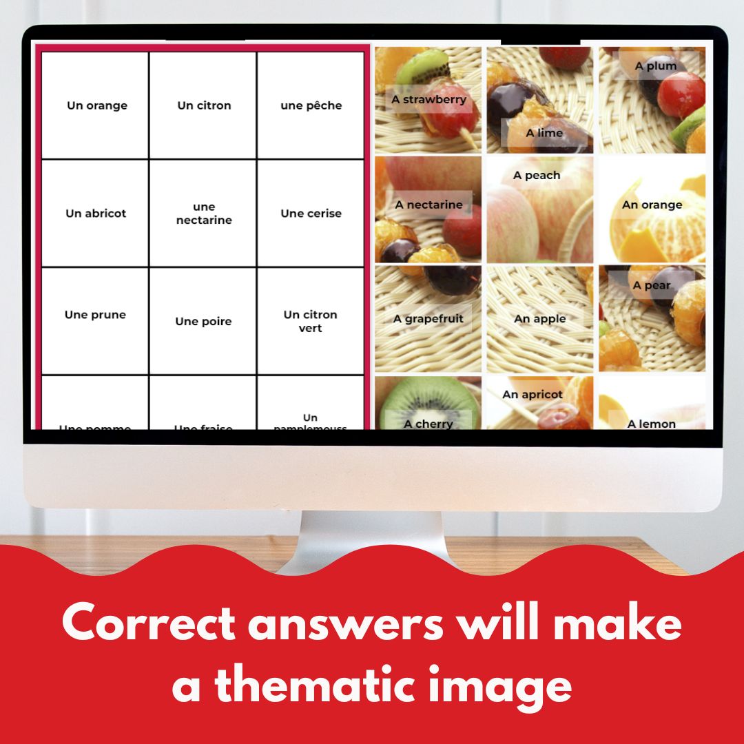 Practice French fruits vocabulary with this pictures tile game – can be played as a Google slides activity or in PowerPoint. Match the English to the French terms to make a picture with a fruit theme. Includes a nice variety of French terms referring to basic fruits as well as some more exotic ones. Easy to grade at a glance – either the student has it correct, or the picture will be messed up.