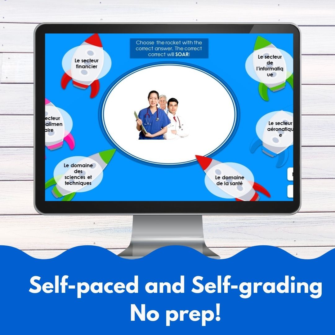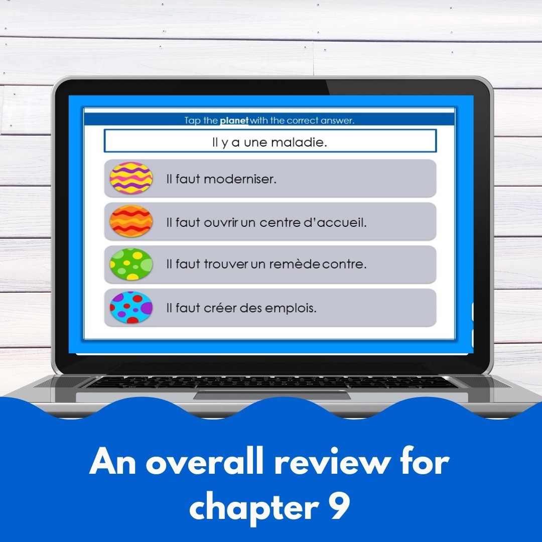 This French level 2 unit 9 digital review game will give your students a quick and fun way to review everything from unit 9 from a popular French textbook series. Answer questions and work through the game, it gives a quick recap of everything that is taught in unit 9. That would include: