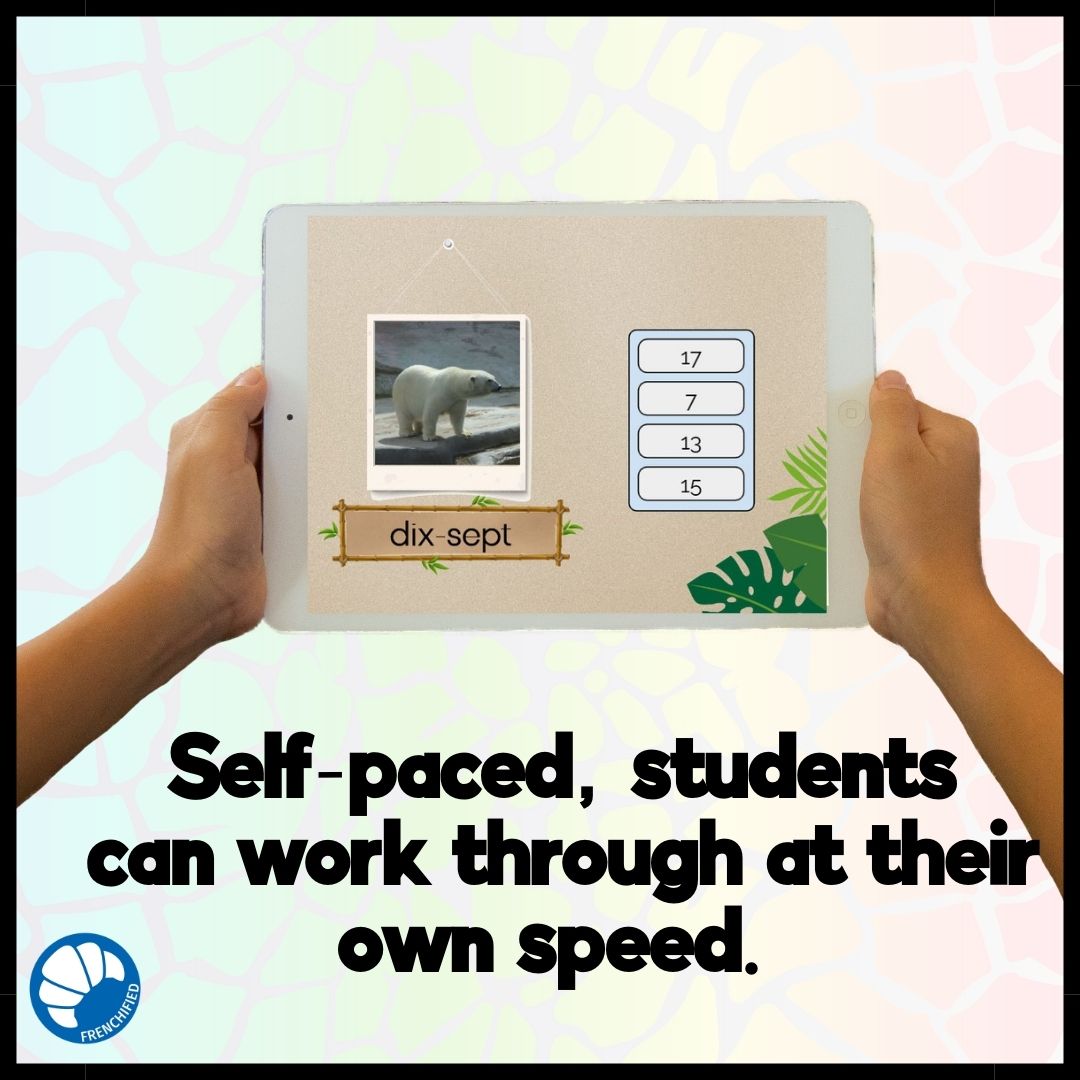 This set of digital task cards practices the French numbers between 1 and 20. There are 22 cards total with 20 different multiple-choice questions. Each card has a photo of an animal with a number written below it. Students will then select the correct digits that match the written number. The cards are self-grading, and students can play through the cards as many times as desired.
