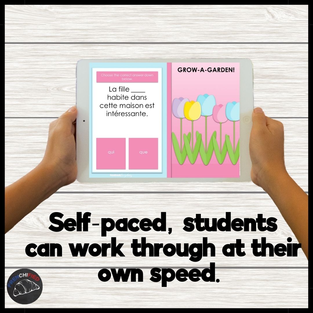 This set of digital task cards practices choosing between French qui or que There are 34 cards total with 30 different multiple-choice questions. The cards are self-grading, and students can play through the cards as many times as desired.