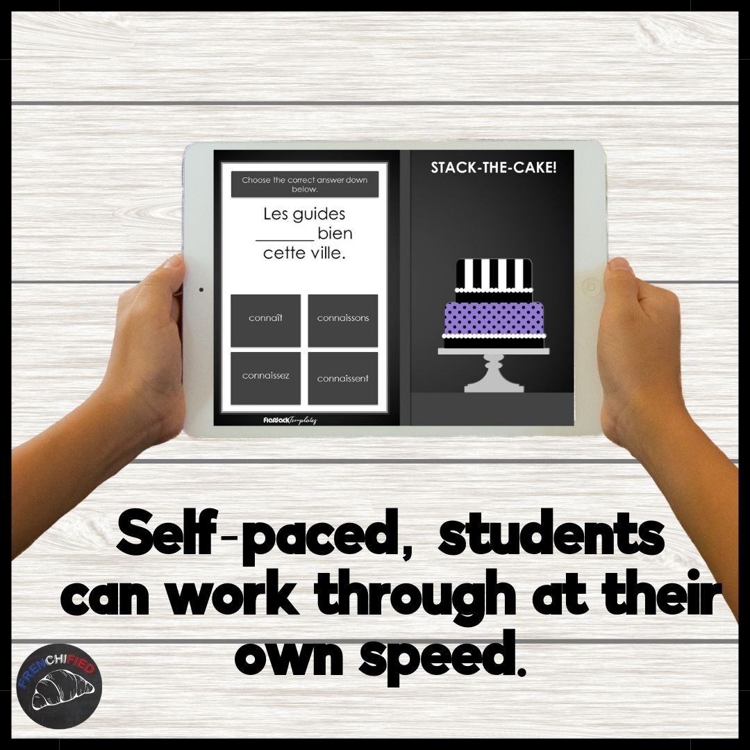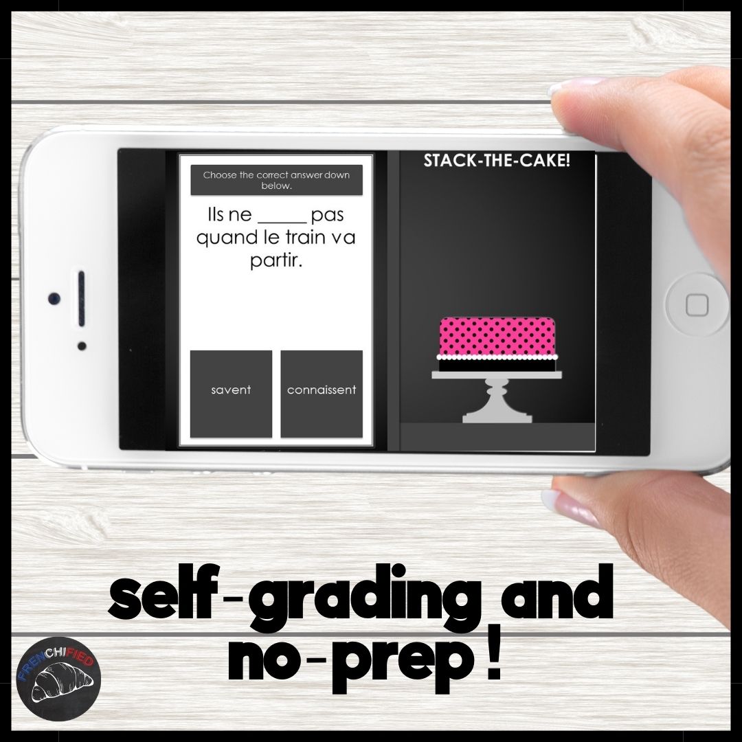 This set of digital task cards practices French verbs savoir and connaître – conjugation and which one to use. There are 34 cards total with 30 different multiple-choice questions. The cards are self-grading, and students can play through the cards as many times as desired.