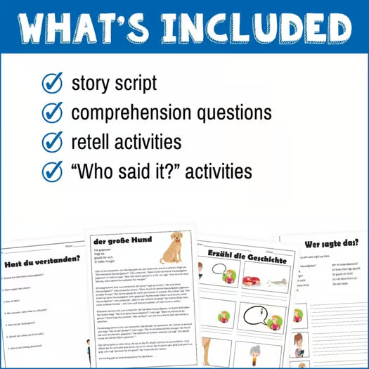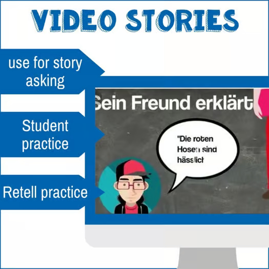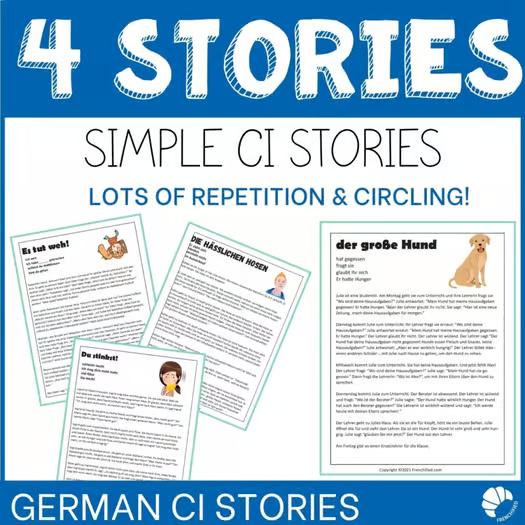 Make learning German fun with this German bundle 2 of comprehensible input German lesson plans and stories. Each lesson plan includes a story with targeted structures that can be repeated to give your students lots of repetitions. Comprehension activities to use after the story will allow you to engage your students and make sure that your German lesson is truly comprehensible input.