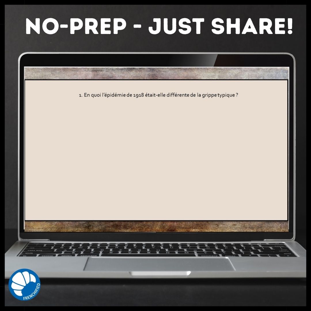 Learn about the pandemic of 1918 in this La grippe de 1918 French reading activity . Includes two versions – one that is suitable for levels 3-4 and one that is simplified for level 2. Level 2 version has imparfait and passé composé while level 3-4 version has some subjunctive as well. Each version has a vocabulary list. Each version has questions in English as well as French. Use cards 1-9 for advanced version and cards 10- 18 for the simpler version. Cards 19-31 have questions in English; cards 32-45 have questions in French.