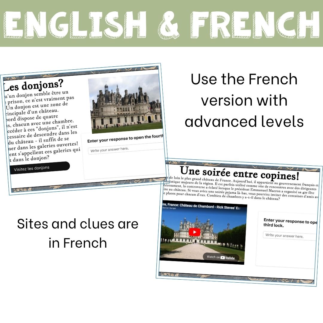 The other version is in French for upper levels. The clues are a little clearer in what the students are looking for, but the information pages are in French so they will still be challenged. The only clue that is NOT in French is a video about the castle – there was not a video in French that had the right information that I thought would be easy enough for French learners to understand, and I would not want them to be frustrated.