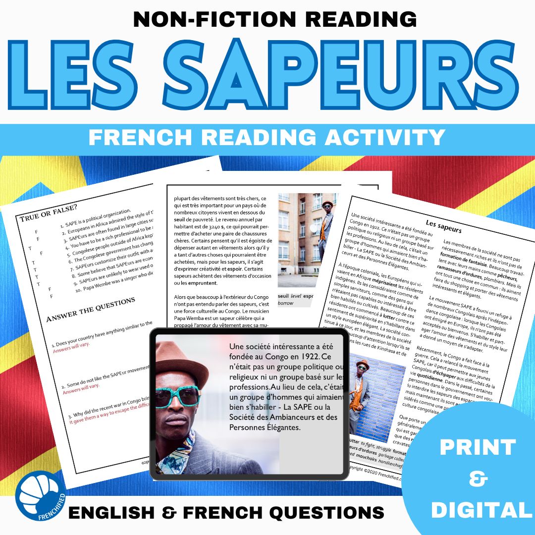 This Sapeurs bundle French reading comprehension activity will teach your students about the history of SAPEurs and their role in African culture. It is suitable for novice-high/intermediate-low students with teacher guidance and higher-level students to work independently. If you teach AP French, this reading can be useful in giving your students practice reading nonfiction articles for the interpretive section of the test. The reading can lead to discussion or writing activities to include the other two modes of communication.