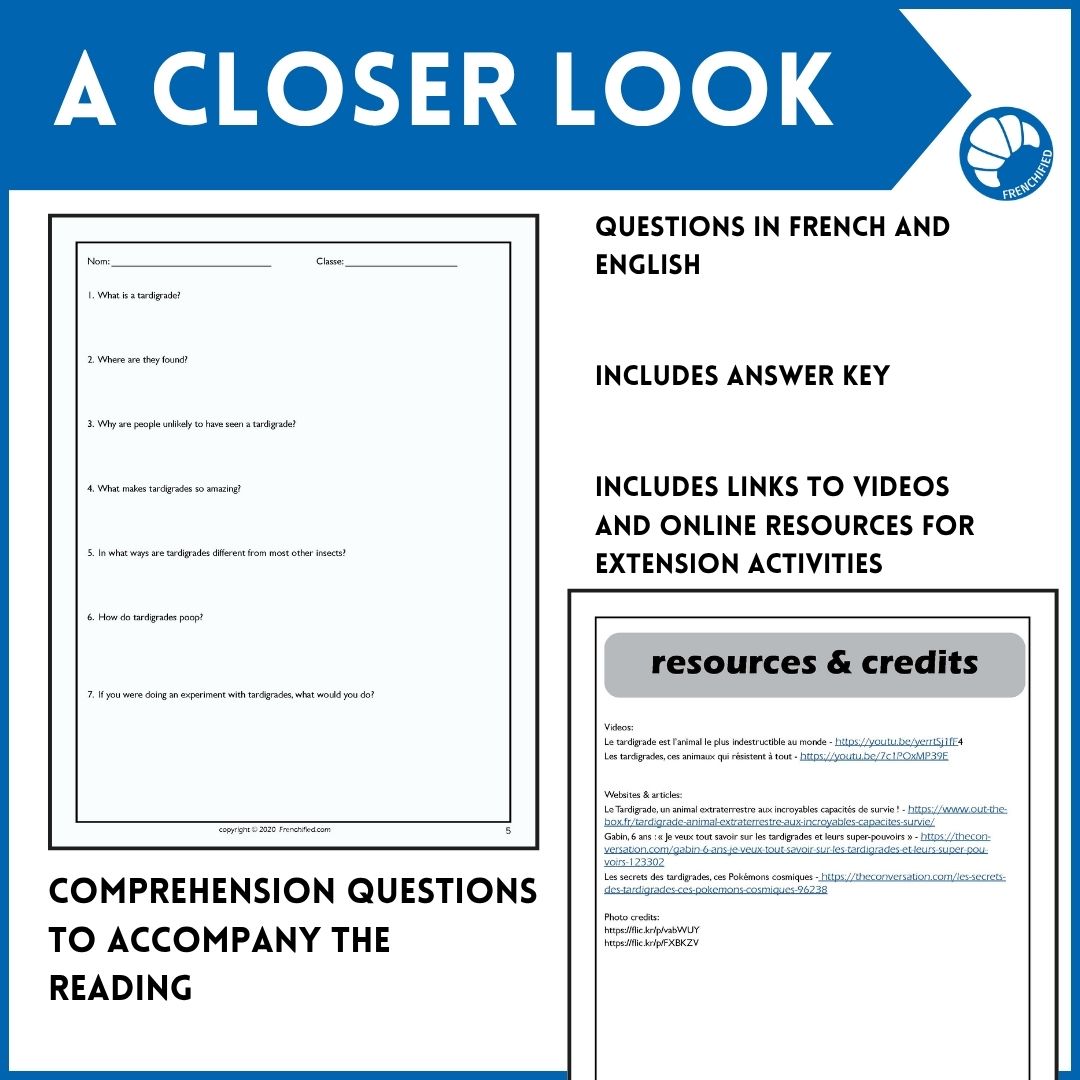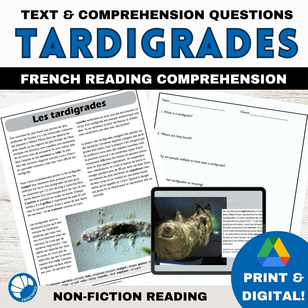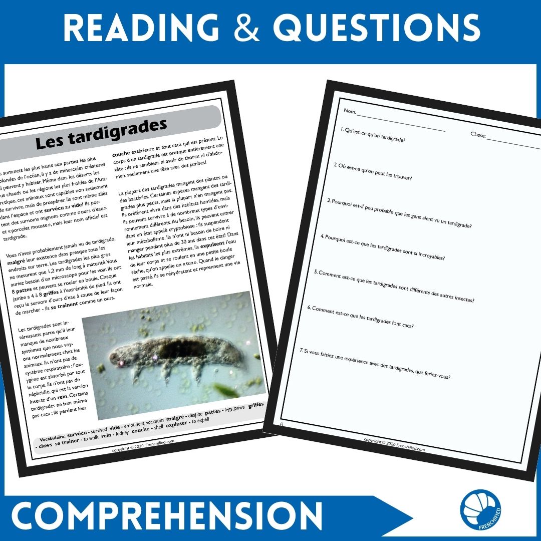 This intermediate French reading comprehension activity will teach your students about tardigrades. The tardigrade is one of the most interesting animals on earth – tardigrades. While you haven’t seen them, they almost certainly live in your neighborhood. They are nearly indestructible, which makes them a great topic of scientific study.