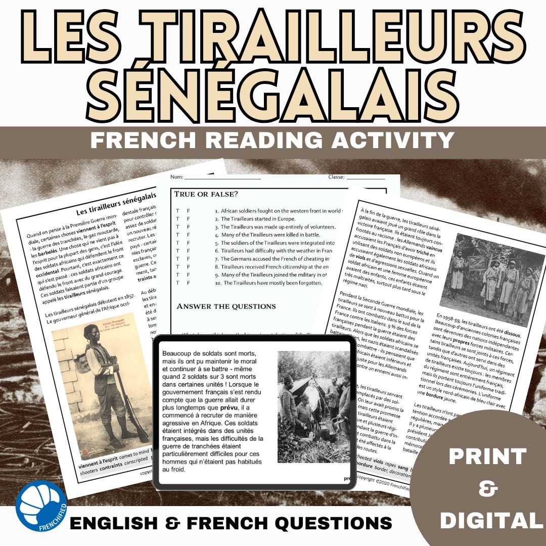 This Tirailleurs Sénégalais bundle French reading comprehension activity will teach your students about the history of les tirailleurs sénégalais, a group of soldiers from Africa who fought for France. Get ready for the release of the upcoming film Tirailleurs starring Omar Sy.