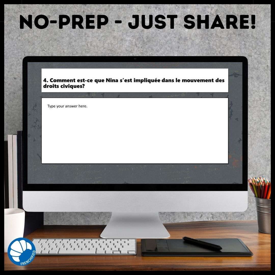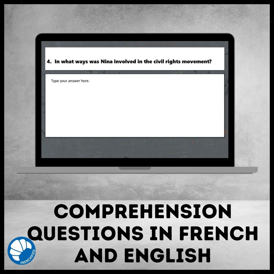 This Nina Simone Google™ Drive French reading comprehension activity will teach your students about the life and accomplishments of civil rights activist and singer Nina Simone. It is suitable for novice-high/intermediate-low students with teacher guidance and higher-level students to work independently. If you teach AP French, this reading can be useful in giving your students practice reading nonfiction articles for the interpretive section of the test. The reading can lead to discussion or writing activities to include the other two modes of communication.