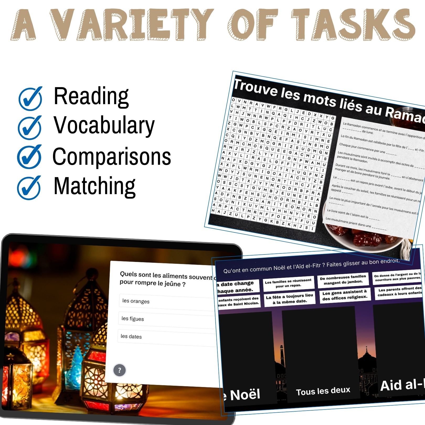 The Ramadan French reading comprehension activities include: