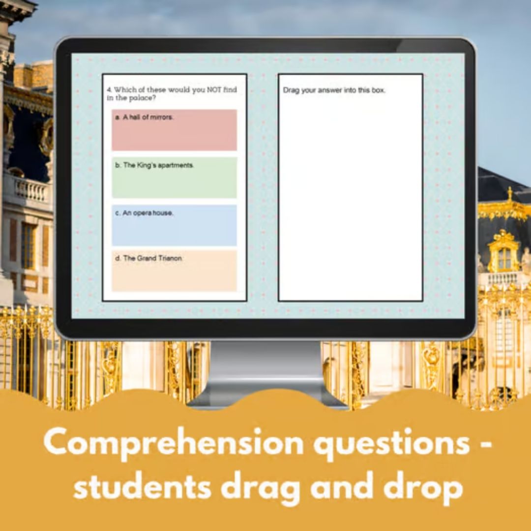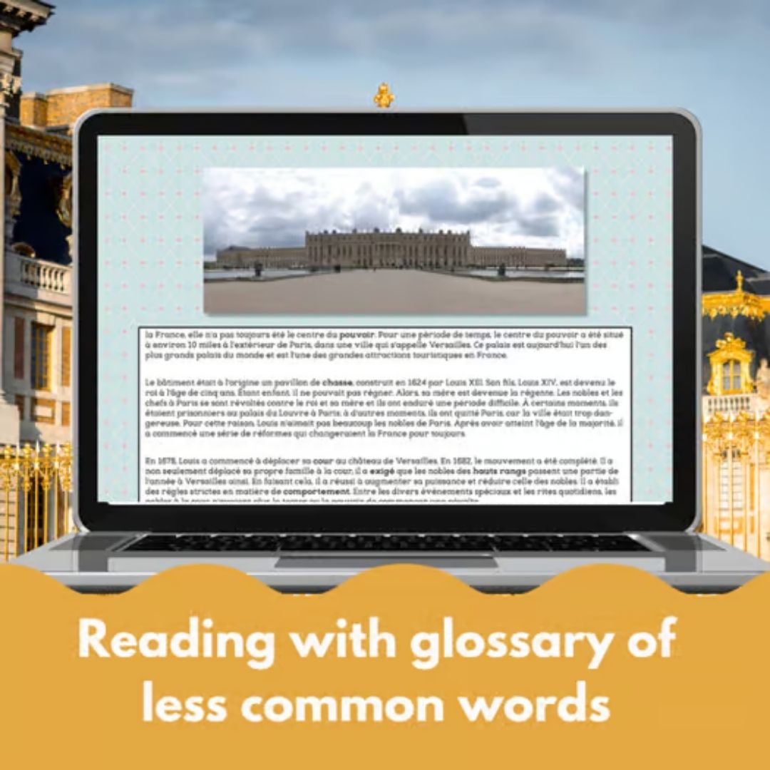 This Versailles bundle French reading comprehension activity will teach your students about the palace of Versailles. Versailles began as a simple hunting lodge, but became the symbol for power and extravagance. Learn the history of this palace and its role in consolidating the power of the king.